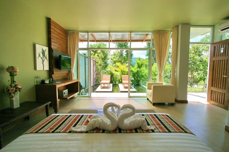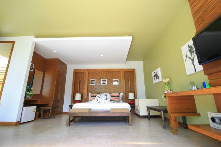 ห้องเดอลุกซ์ 1 เตียงใหญ่ สำหรับ 2 ท่าน ห้องอาบน้ำ ฝักบัว จากุซซี่ ระบบน้ำอุ่น น้ำเย็น พร้อมทีวีสัญญาณเคเบิ้ลจานดาวเทียม แอร์ ตู้เย็น สัญญาณอินเตอร์เน็ต WI-FI ไว้บริการ พร้อมมุมพักผ่อนบนเตียงไม้ให้ความร่มรื่นแวดล้อมด้วยดอกไม้เบิร์ดออฟพาราไดส์ในความเป็นส่วนตัว